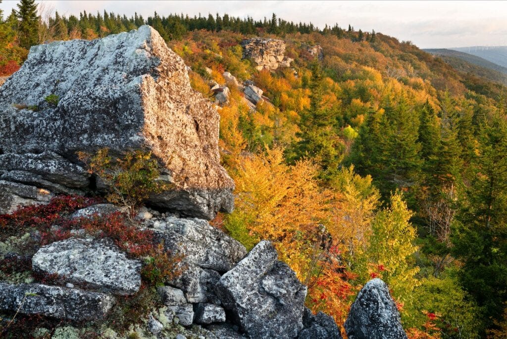 The changes elevation brought at Bear Rocks were immediately evident. As we approached, we discovered a vista of hundreds of acres of wild blueberry bushes with flaming red foliage, contrasting against the evergreens and exposed light-colored rocks of the region. I had seen this kind of ecosystem countless times, as I worked on client photos of Alaska over the years, but I had never traveled far enough north to see it myself, and I never expected to find it in West Virginia.
