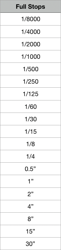 If you don't have this chart memorized, take some time to learn it, and understand how cutting the amount of time in half cuts the amount light in half, and how doubling the time doubles the amount of light.