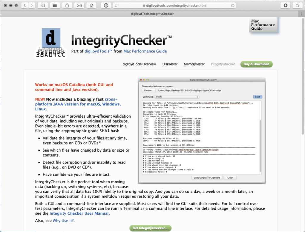 IntegrityChecker validates files in a very unique way. It creates a cryptological hash for every file on a storage volume that can be used to check if the file has been changed in any way. This lets you check the integrity of files and backups in the most efficient way I know how.