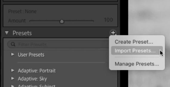 To load presets, choose the Develop module, find Presets on the left, click on the plus button and choose Import Presets. Then, choose this preset and import it.